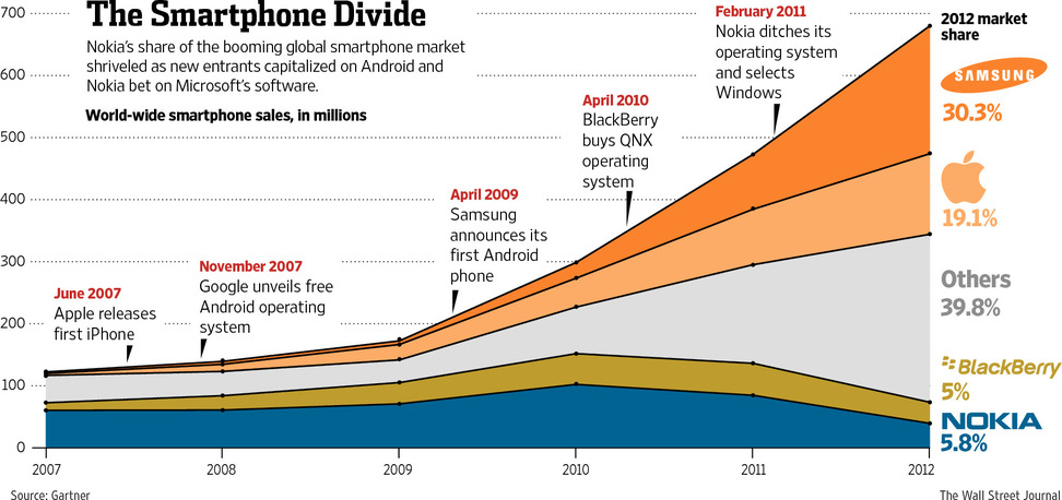As the market slowed due to the flattening of the penetration curve, the industry consolidated, with Sony buying Ericsson’s phone business, Microsoft and Nokia eventually creating a partnership, and most any other phone manufacturer not named Apple choosing the Android operating system.