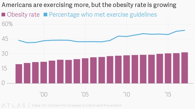 However, using exercise for significant weight reduction to counter a poor diet is a failed strategy. Food companies are taking the position, more and more, that exercise is the key…”eat whatever you want, just exercise more.” But that hasn’t worked, even according to our own CDC, as represented in the below graph through 2017 which showed obesity rising even as the percentage of Americans meeting the exercise guidelines was on the slight rise.